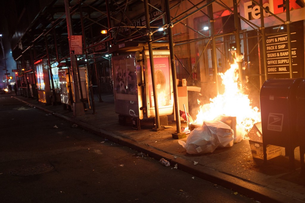 The NYPD reported 27 arrests as five officers suffered minor injuries. The protesters also damaged nine police vehicles and spray-painted a police van, several bus shelters, a Chase Bank and a statue of Christopher Columbus outside Brooklyn Supreme Court.